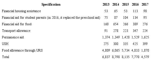 In view of their purposes (Table 3), financial aid for housing, food, and transport is granted to undergraduates who are on campuses outside the institution's headquarters that do not have urs or ushs yet, while ensuring that these campuses can directly take on this expenditure. In the same way, the transport allowance is passed on to students on campuses located in cities where there is no offer of public transport. Table 4 shows that there was an increase in the amounts of financial aid and other benefits in 2014, 2015, and 2016, periods in which the studied HEI opened new undergraduate programs on both campuses outside its headquarters and the main campus. Student aid and benefit programs are funded by resources from the NSAP and other sources, according to the institution's budgetary availability (ECI 24/2016).