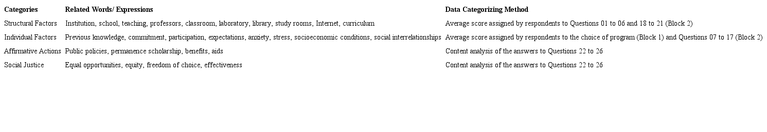 As indicated in Table 5, the words and expressions used for structural factors related to the permanence and performance of undergraduate students are listed in Questions 01 to 06 and 18 to 21 of the questionnaire. The expressions categorized as individual factors related to the permanence and performance of undergraduate students are listed in Questions 07 to 17. The words and expressions aligned with the AA and Social Justice categories were verified by the content analysis of the answers to Questions 22 to 26.