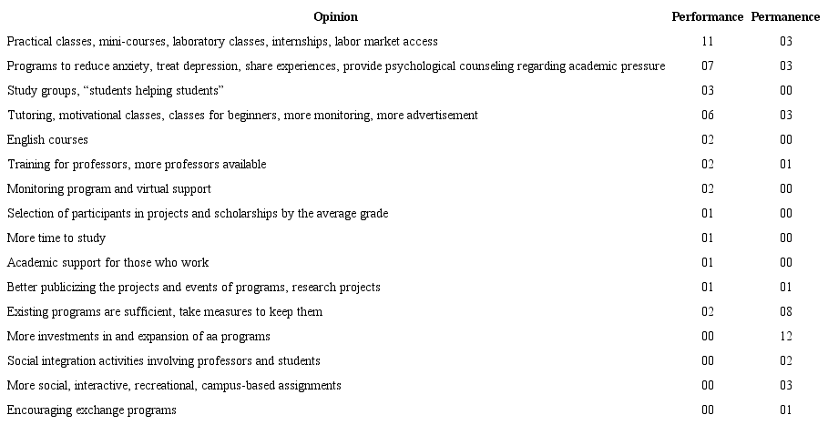 Respondents were asked to give their opinion regarding academic support programs that the institution could implement to contribute to improving academic performance (Question 24) and permanence (Question 25). Similar answers were obtained, categorized, and quantified, as shown in Table 8.