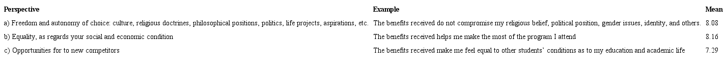 The considerations taken into account by Respondent 26 (Table 9) refers to the need for the entity responsible for resource allocation to guarantee that the process occurs as provided in the regulations; that is, that the beneficiaries meet the requirements and, in return, attend all classes and have an outstanding academic performance. This leads us to review Rawls (2000), who rejects the postulate that “justice is happiness according to the virtues” (p. 342) since the equity presented in the theory of justice indicates that it is impossible to define virtue from legitimate expectations and moral merit. Thus, as the author suggests, the institution should ensure fairness in the distribution of aids and benefits.