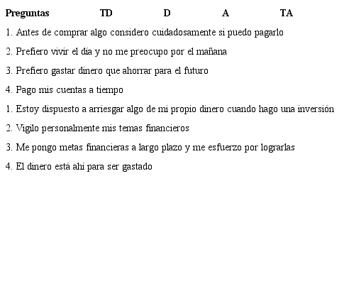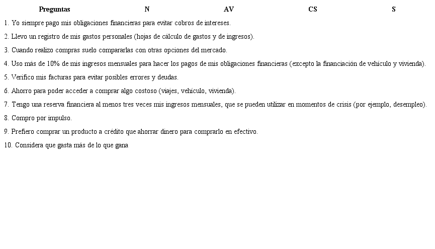 1. Imagina que tienes $100,000 en la cuenta de ahorros y el banco te da una rentabilidad simple del 10 % anual. ¿Después de 5 años la cantidad de dinero que vas a tener en tú cuenta es? Más de $150,000 Exactamente de $150,000 Menos de $150,000___ No sé 2. Imagínese que la tasa de interés que le da el banco a su cuenta de ahorros es del 6 % al año y la inflación es del 10 % anual. Después de un año, ¿cuánto vas a ser capaz de comprar con el dinero de esta cuenta?: Más de hoy___ Exactamente lo mismo___ Menos de hoy___ No sé 3. Imagina que en Colombia Daniel hereda $100.000 hoy y los guarda bajo el colchón y Pedro hereda $100.000 en cinco años. De acuerdo con el valor temporal del dinero, ¿quién va a ser más rico?: Pedro___ Daniel___ Son igual de ricos___ No sé 4. Suponga que tiene un salario de 800.000 pesos, ¿cuál de estas opciones sería la adecuada para manejar ese dinero en el mes?: 50 % para gastos básicos, 20% para ahorro y 30% para gastos personales___60% para gastos básicos, 10% para ahorro y 40% para gastos personales___40% para gastos básicos, 0% para ahorro y 60% para gastos personales___ 5. Sabe usted quién regula los precios de la canasta familiar en Colombia?: DANE __ El gobierno El dueño del supermercado __ El presidente de la República__ Comportamiento financiero: responda las siguientes preguntas de acuerdo a la siguiente escala 1. Nunca (N); 2. Algunas veces (AV); 3. Casi siempre (CS); 4. Siempre (S)