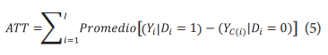 Esta ecuación muestra el individuo en el grupo de control tal que la distancia entre su probabilidad predicha de participación y la probabilidad predicha de participación del individuo tratamiento sea mínima. En el caso de emparejamiento por vecino más cercano y, de acuerdo con Bernal y Peña (2014), el impacto promedio del programa sobre los tratados ATT viene dado por la siguiente ecuación: