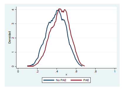 Como se observa, en este caso el límite bajo de la región de soporte común (valor mínimo de la variable) es 0,097, y el límite superior (valor máximo de la variable) es de 0,690. La media de la propensión a participar es de 0,412, con una desviación estándar de 0,096. En la Figura 1 se presentan las funciones de densidad de probabilidad empíricas para el grupo de estudiantes cubiertos y no cubiertos por el programa. En este caso, los extremos de las dos distribuciones no exhiben grandes diferencias, lo que implica que gran parte de las observaciones se pueden utilizar en la estimación del efecto causal.