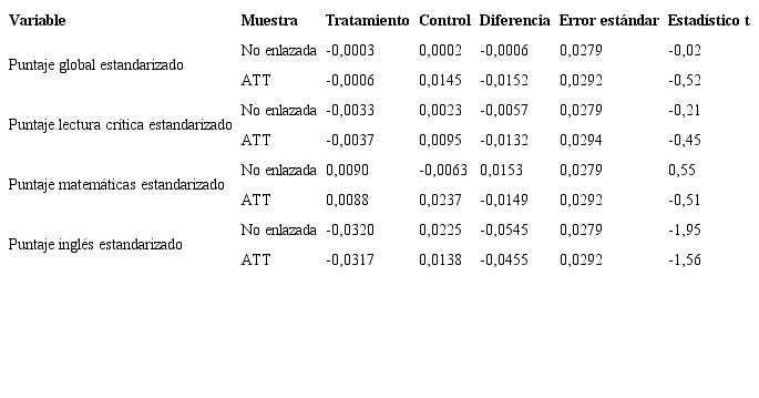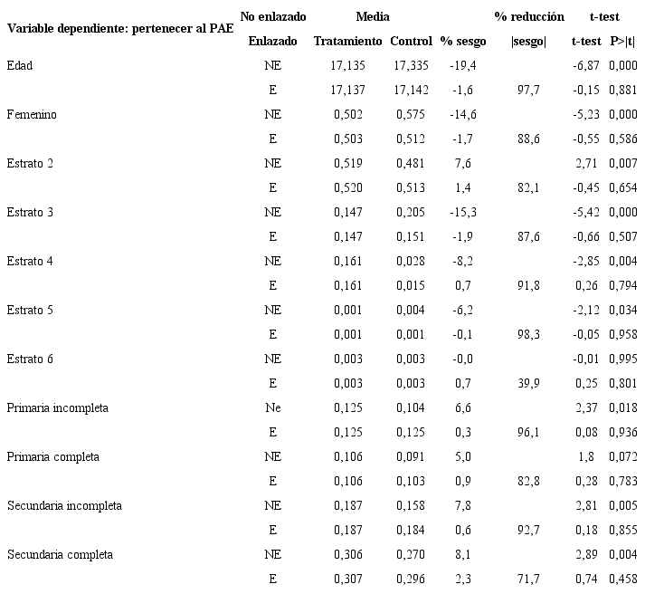 En la Tabla 8 se presentan los resultados detallados del test de igualdad de medias para las variables consideradas en el modelo de acuerdo con la muestra inicial (no enlazada) y con la muestra obtenida a partir de la propensión a participar (enlazada). En la Tabla 8 se relacionan las medias de las variables en el grupo tratamiento y control, el porcentaje de sesgo en cada caso y la reducción del sesgo en valor absoluto, una vez se han enlazado los estudiantes en la muestra. La Tabla 8 también reporta el valor estadístico t de la prueba y su p-valor para cada caso.