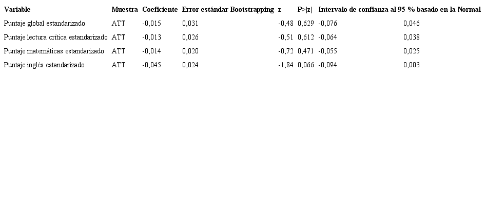 En esta sección se presentan los resultados de la estimación de modelo econométrico basado en la muestra enlazada en el paso anterior. El impacto del programa se calcula sobre el promedio de los tratados, tal como se explicó en la metodología del trabajo. Los resultados se presentan para el puntaje estandarizado global y para los puntajes estandarizados de las áreas de lectura crítica, matemáticas e inglés. La significancia estadística de los impactos estimados se evaluará a partir del cálculo de errores estándar mediante la técnica de boostrapping.