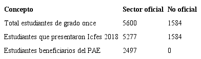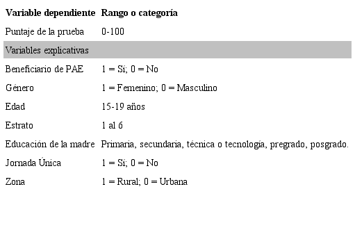 Los datos del presente estudio provienen de dos fuentes. La primera es la base de datos del Icfes de las pruebas Saber 11 para el 2018, y la segunda son los beneficiarios del PAE en el 2018; la información de estos últimos proviene del Simat (Sistemas de Matrículas Estudiantil), el cual fue suministrado por la Secretaría de Educación Municipal de Ibagué. La base de datos del Icfes contiene información sobre el desempeño académico de los estudiantes de grado once de todo el país y sobre las variables sociodemográficas, socioeconómicas y socioespaciales de los estudiantes. Es conveniente resaltar que la base de datos de los beneficiarios del PAE tiene su énfasis en la Resolución N.o 29452 del 29 de diciembre de 2017, en la que se exponen los criterios de focalización para estudiantes de instituciones oficiales.