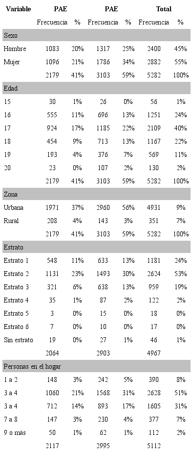 En la Tabla 4 se presentan las características sociodemográficas de los estudiantes de grado once en términos del sexo y la edad. De acuerdo con la tabla, el porcentaje de estudiantes que se benefician del programa es del 41%. Gran parte de los estudiantes de grado once son mujeres (55%), y de estas el 21% recibe PAE. En el caso de los hombres, los que se benefician del programa representan el 20% de la población. Los estudiantes beneficiados se encuentran, principalmente, entre los dieciséis y los diecisiete años de edad.