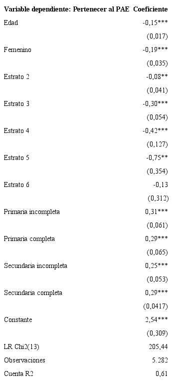 Donde la probabilidad de que ocurra el evento P(I =1|X) (probabilidad de que reciba PAE), está condicionada por el conjunto de variables explicativas X (edad, género, estrato, etc.). En el presente trabajo, la probabilidad de participación en el programa se realiza a partir de un modelo probabilidad probit bivariado, tal como se presenta en la ecuación (2).