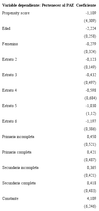 Una vez se ha estimado la propensión a participar, se evalúa este procedimiento. En la Tabla 7 se presentan los resultados del modelo probit de participación en el que se incluye como variable explicativa la variable de propensión a participar estimada del paso anterior. De acuerdo con los resultados, ninguna de las variables es estadísticamente significativa. Esto implica que el modelo de participación estimado en el paso anterior es el adecuado, ya que la inclusión de la nueva variable explicativa (propensión a participar) no resulta estadísticamente significativa y las variables que antes los eran, ahora ya no lo son.