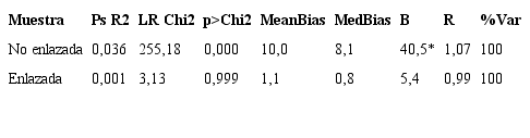 En la Tabla 9 se presentan los resultados de un test para evaluar el balance de las muestras. Como se observa, el grupo control y tratamiento en la muestra no enlazada exhibe un desbalance, dado que se rechaza la hipótesis nula de igualdad de grupos mediante un test de ratio de verosimilitud (Chi2 = 255,18 y p-valor < 0,000). Sin embargo, cuando se considera la muestra enlazada no es posible rechazar la hipótesis nula de igualdad de grupos. En este caso, tanto el grupo tratamiento como control están balanceados en la muestra.