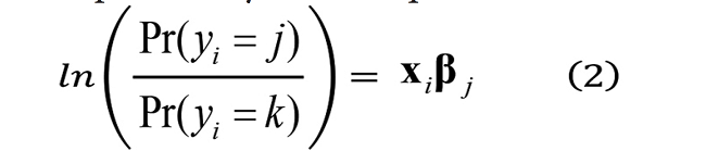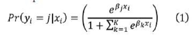 Thus, logit multinomial model gives the individual i the probability of choosing category j among probabilities. In this case, the mathematical expression representing the chosen probability canbe Equation 1.
