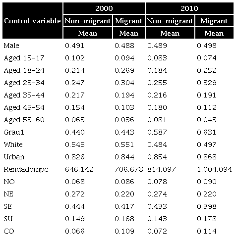 Table 2 presents the mean values of each variable in both years under analysis. The male variable is the control category and takes a value of 1 for men and 0 for women. For the age variable, the control category is the first range, namely, 15 years. The Grau1 variable refers to people with completed high school. The white variable takes the control category and receives a value equal to 1 for whites and 0 for black population. The urban variable refers to people who live in an urban area of a municipality in Brazilian territory; thus, it takes a value equal to 1 for residents of urban areas and 0 for the opposite. The rendadompc variable takes per capita household income for non-migrants and migrants in 2000 and 2010. Finally, the region variable takes NO for residents of the northern region, NE for residents of the Northeast, SE for residents of the Southeast, SU for residents of the South, and CO for residents of the Midwest region of Brazil.