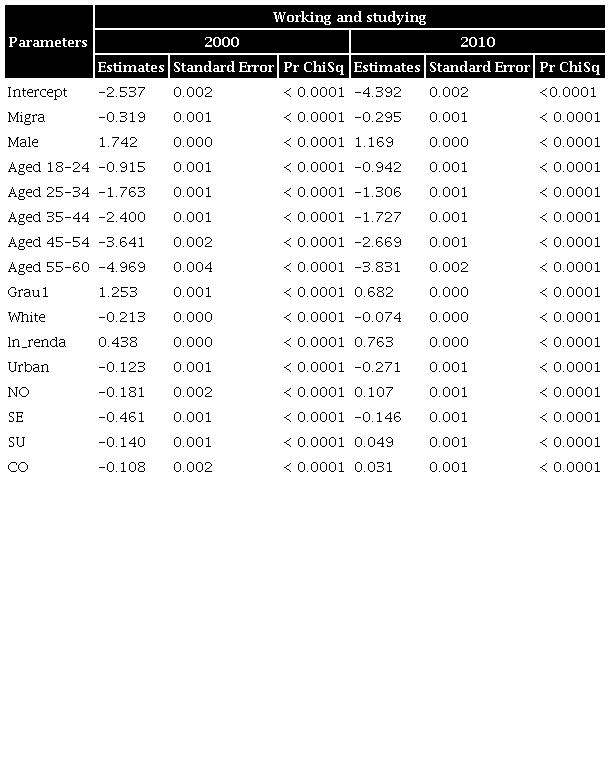 Likewise, the propensity to only study is more significant for white men with first grade residing in urban areas and, in 2010, in the North of the country. The per capita household income logarithm has a positive influence on the only studying choice, that is, the larger the ln_renda, the greater the propensity to be in this condition.
