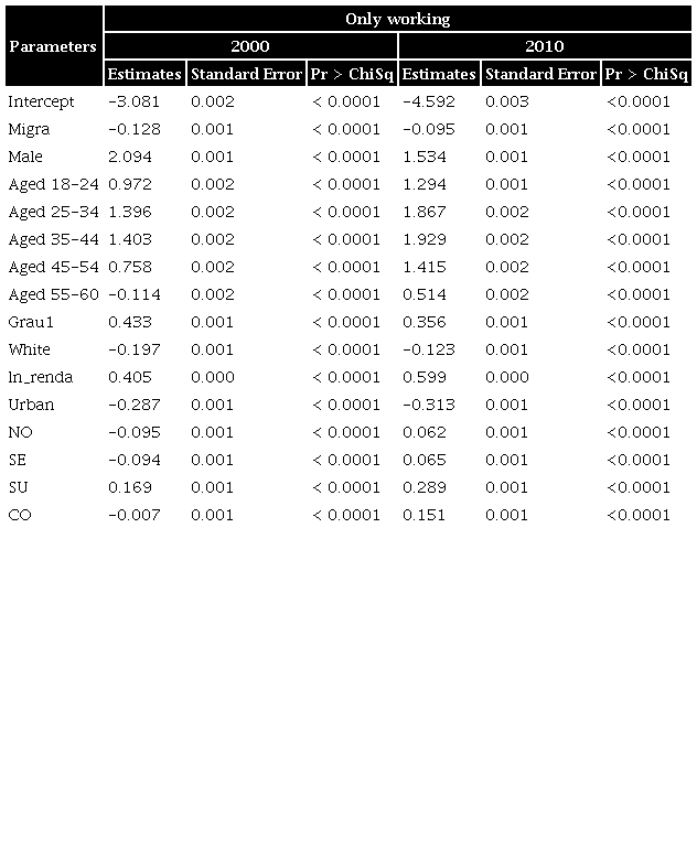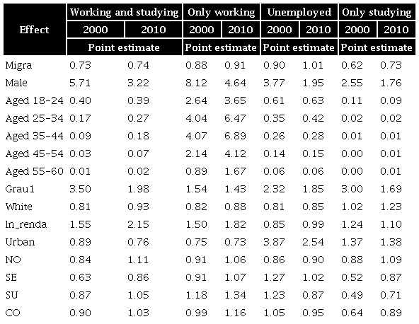 Based on the point estimates (oddsratio) presented in Table 7,4 it is possible to have the odds ratios of each individual belonging to each category in 2000 and 2010. From the results, the chances of working and studying in both years are lower for migrants than for non-migrants. Also, for all categories, the migrants' chances of insertion are lower than for non-migrants in 2000 and 2010. About the chances of being unemployed, migrants have greater odds ratios than non-migrants in 2010.