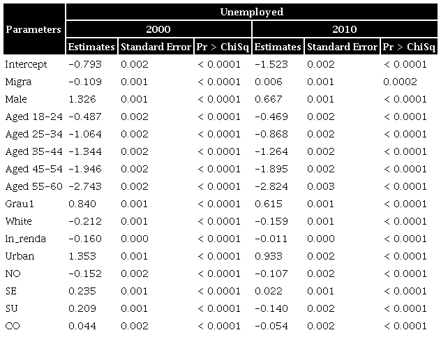 Concerning the propensity to be unemployed, in 2000, it is higher for men, young people with low schooling, living in urban areas of the Southeast, South and Midwest regions, compared to Brazilian Northeast. These results are similar to the classic studies for Brazil. On the other hand, being a white migrant, aged over 18 years, and low-income resident of the North part of the country reduces the propensity to be unemployed.