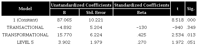 The constant-coefficient (b=110.999, t=11.421) and the transactional leadership coefficient (b=14.741, t=4.267) are significant at p<.001. Additionally, the independent variable coefficient (b1=14.741, p<.001) shows a positive relationship between job satisfaction and transactional leadership. As a result, the H1.a. is supported.