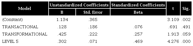 The constant-coefficient (b=91.482, t=9.162) and the predictor coefficient (b=7.515, t=6.133) are significant at p<.001. Additionally, the independent variable coefficient (b1=7.515, p<.001) shows a positive relationship between job satisfaction and level 5 leadership; as a result, the H1. c. is supported.