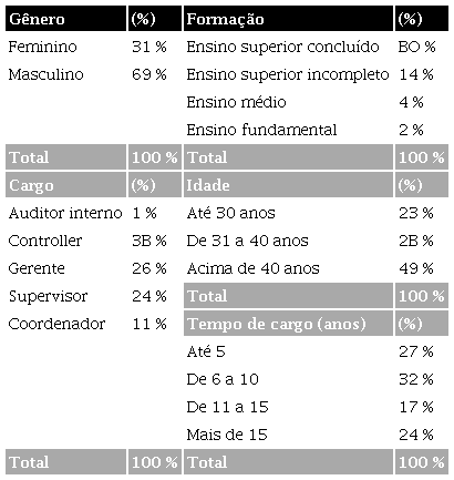 A amostra final foi de 98 respostas válidas. Foram enviados 107 questionários e todos responderam; no entanto, nove respostas foram excluídas por não terem preenchido o questionário de maneira completa. O questionário foi enviado via e-mail, em formato Word e Excel, a fim de facilitar o preenchimento pelos gestores.