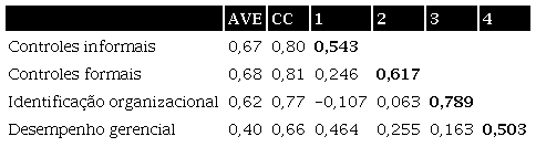 Observa-se que os construtos se apresentam válidos com relação à validade convergente, uma vez que a AVE de todos os construtos foram superiores a 0,50, com exceção do desempenho gerencial. Quanto à validade discriminante, o critério Fornell e Larcker também foi confirmado, o que indica que os construtos são distintos entre si. No que tange à confiabilidade, a cc de todos os construtos foi superior a 0,70. Destaca-se que, embora a AVE e a cc do desempenho gerencial tenham sido de 0,40 e 0,66, respectivamente, manteve-se no modelo devido a sua importância e a ter atendido à validade discriminante, como recomendado por Hair et al. (2016). De modo geral, confirma-se o atendimento do critério de mensuração. Efetua-ram-se também testespost hoc e os viés do método comum e da não resposta não constituem uma preocupação para o modelo. Quanto à colineari-dade do VIF, foi inferior a 0,50, o que demonstra ausência da multicolinearidade.