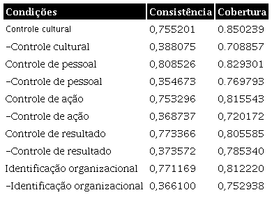 A Tabela 4 revela que o construto controle de pessoal é quase sempre necessário, enquanto o controle cultural, de ação e de resultado apresentaram consistências inferiores a 0,80, o que aponta a necessidade de prosseguir na análise e executar a truth table (tabela verdade).