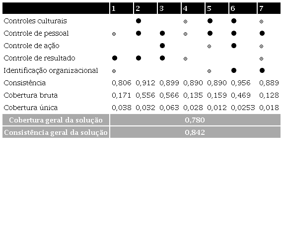 A primeira solução compartilhada por 17 % indicou a seguinte configuração ~Controle de pessoal x Controle de resultado x ~Identificação organizacional. Já a segunda solução formada por Controle cultural x Controle de pessoal x Controle de resultado foi compartilhada por 55,6 % dos gestores. A terceira solução compartilhou a percepção de 56,6 % dos gestores e teve como configuração Controle de pessoal x Controle de ação x Controle de resultado. Enquanto a quarta solução apresentou ~Controle cultural x ~Controle de pessoal x Controle de ação x ~Controle de resultado e foi compartilhada por 13,5 % dos gestores. A quinta solução sugeriu a solução Controle cultural x Controle de pessoal x ~Controle de ação x ~Identificação organizacional e foi compartilhada por 15,9 % dos gestores, e a sexta solução foi compartilhada por 46,9 % dos gestores e teve a solução Controle cultural x Controle de pessoal x Controle de ação x Identificação organizacional. A sétima solução demonstrou a configuração de -Controle cultural x Controle de pessoal x ~Controle de ação x ~Controle de resultado x Identificação organizacional, que foi compartilhada por 12,8 % dos gestores.