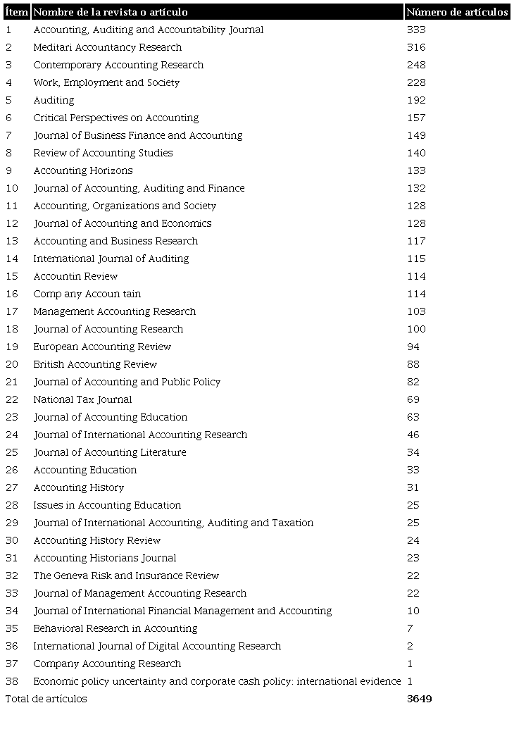 1. Selección de revistas y artículos de investigación contable: fueron escogidas 38 revistas y seleccionados 3649 artículos publicados entre 2014 e inicios de 2020 (búsqueda realizada en el primer trimestre de 2020). En la Tabla 1 se muestran las revistas y el número de artículos seleccionados por cada una de ellas.