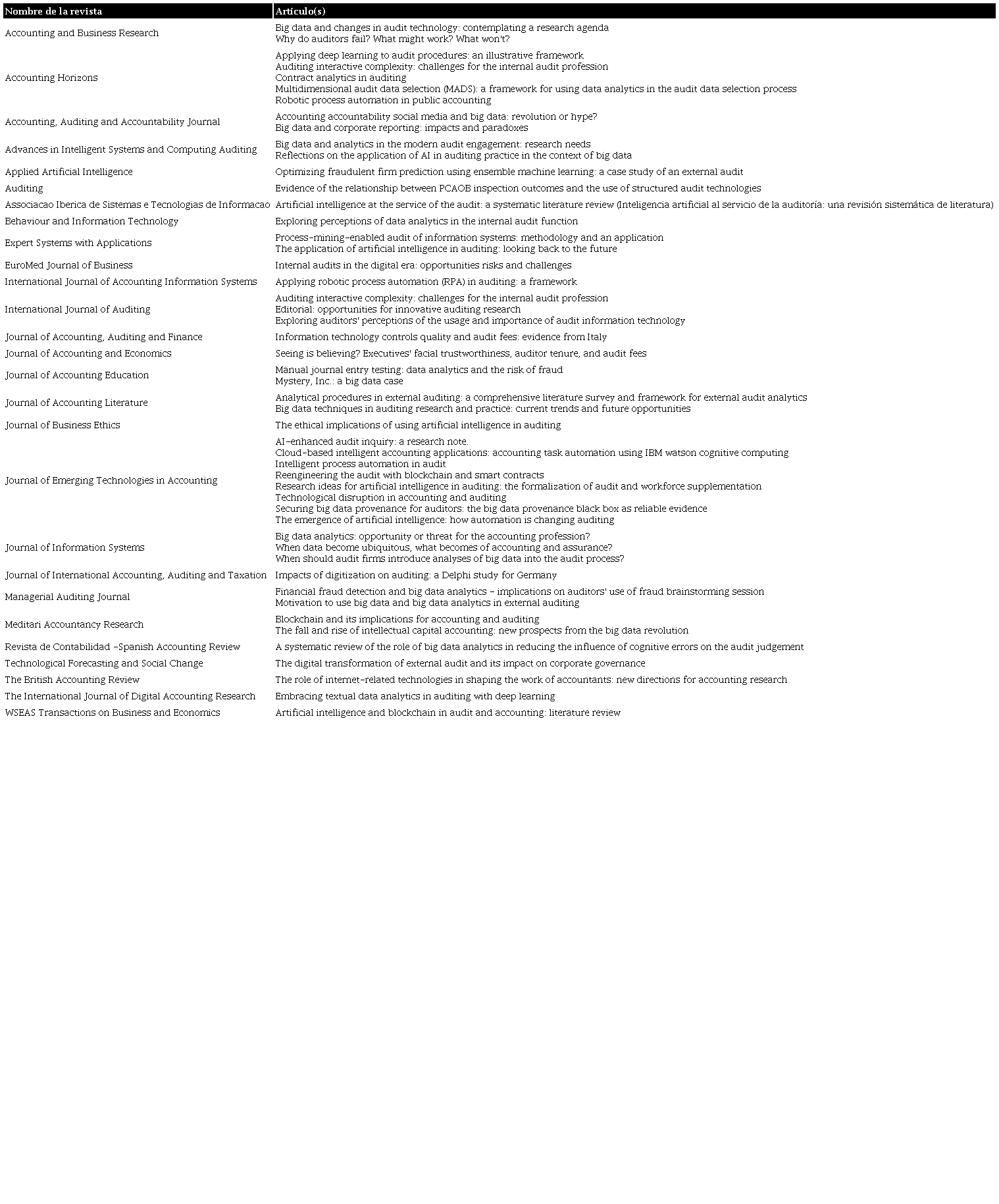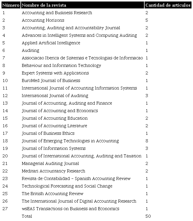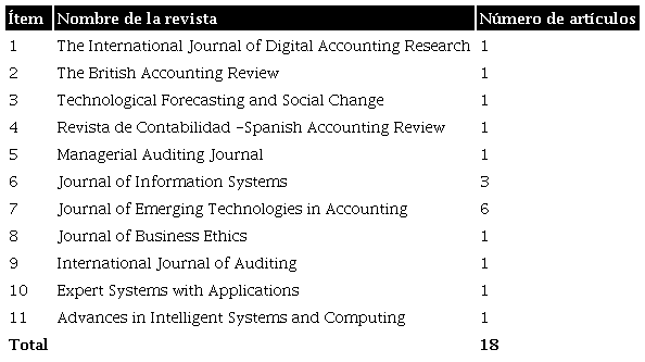 Una vez revisados los artículos, se puede concluir de manera temprana que el 80 % de los seleccionados corresponden a los últimos cuatro años, lo cual denota la relevancia actual del tema escogido. Y por otra parte, hay tres revistas que contemplan el 26 % de los artículos, estas son Journal of Emerging Technologies in Accounting y Accounting Horizons. Las categorías de análisis identificadas en este artículo que permitieron presentar los resultados fueron: