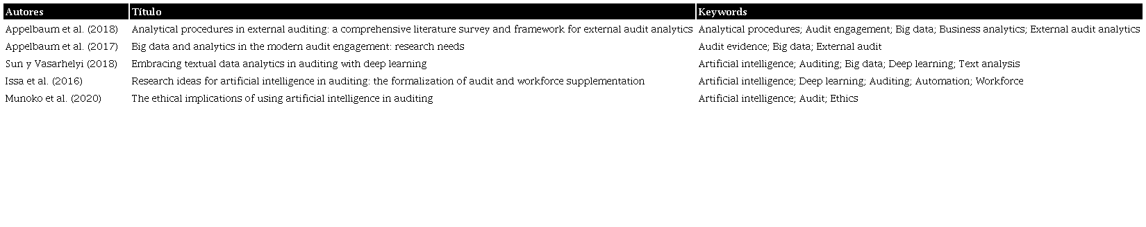 Con el objetivo de acotar a un máximo de 50 artículos, la literatura por revisar para tener un número que permitiera hacer una revisión sistemática de literatura, se realizó la búsqueda en la matriz bibliográfica de la asociación entre las siguientes palabras clave: "disruptive technologies", "digital transformation", "audit 4.0", "big data", "analytics", "machine learning", "automation", "improvements in the audit process", "innovation audit" y "artificial intelligence". Para complementar la búsqueda de investigaciones relevantes para el tema de investigación, se consultaron otra vez en Scopus nuevas fuentes también catalogadas en el primer cuartil. La búsqueda se hizo mediante conectores asociativos entre las áreas de auditoría y tecnología/sistemas de información. Los criterios de inclusión de la nueva búsqueda fueron: documentos que mencionan auditoría externa y tecnología digital (big data, IA, blockchain, ML); documentos que hablan de mejoras en los procesos de auditoría externa mediante el uso de tecnología; documentos que discuten algunos aspectos de procedimientos analíticos en el proceso de auditoría en casos prácticos; y artículos publicados en revistas científicas y citados en Scopus.