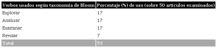 Que el tipo de enfoque cualitativo sobresalga sobre el cuantitativo tiene sentido cuando se analiza en un alto nivel los verbos más utilizados por los autores en la redacción de los objetivos de las investigaciones analizadas durante esta revisión de literatura. De acuerdo con la taxonomía de Bloom, los verbos que se muestran a continuación son frecuentemente utilizados para los niveles cognoscitivos de análisis, por lo que están más asociados a enfoques cualitativos, a diferencia de verbos como "determinar", "evaluar" o "estimar" que se relacionan más con los enfoques cuantitativos (Tabla 6).