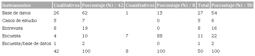 Los artículos que abordan un enfoque cualitativo (42), se centraron en una revisión sistémica de literatura y recolección de información de diferentes fuentes tanto primarias como secundarias, estructuradas y no estructuradas, como se muestra a continuación. Entretanto, 8 artículos fueron realizados con una metodología cuantitativa. Del total de artículos, como puede verse en la Tabla 7, el 54 % (correspondiente a 27 artículos) realizaron una revisión de literatura apoyada en la consulta de diferentes bases de datos con información relevante del tema, mientras que el 22 % (11 artículos) utilizaron encuestas y un 16 % (8 artículos) hicieron uso de las entrevistas aplicadas a grupos variados (estudiantes de contabilidad, auditores, gerentes o líderes de principales firmas de auditoría), a través de la recolección de información de fuentes primarias para luego ser analizadas. Como conclusión, el instrumento más utilizado por los diferentes autores fue la revisión de literatura, seguido de las encuestas y entrevistas. Este resultado combina los métodos cualitativos y cuantitativos.