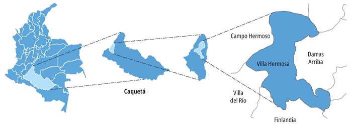 El estudio se desarrolló en el corregimiento de Villa Hermosa, vereda Santo Domingo, ubicada en Florencia-Caquetá, Colombia, la cual se localiza entre la latitud 1°36’27,12’’N y longitud 75°43’53,65’’O (figura 1). En la vereda Santo Domingo existen 236 predios que representa cerca de 395,9 hectáreas de suelos para cultivos y 181 predios con cerca de 1 960,2 hectáreas destinadas a la producción pecuaria (Pulecio, 2017).