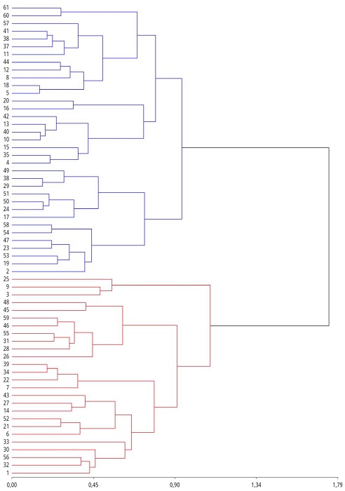 Tipificación de las fincas a partir del análisis multivariado. Una vez caracterizadas las fincas en sus aspectos estructurales, sociales, políticos, económicos y ambientales, se procedió a hacer un análisis de conglomerados a partir de las variables analizadas. Se encontró que los agrupamientos fueron estadísticamente válidos para las variables: precio por hectárea, extensión del predio, usos del suelo (hectáreas en bosque, en cultivos y en pasturas), ingresos, gastos, la actividad económica ganadera y agrícola, el nivel educativo del productor, la edad y el número de personas en el hogar. El dendrograma muestra que la tipificación dada por los conglomerados conformados, hasta el 50 % de la distancia (1,40), permite definir claramente dos agrupaciones (ver figura 2 y tabla 8).