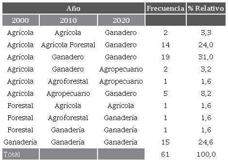 El 70 % iniciaron como parcelas agrícolas, el 5,4 % tenían plantaciones forestales y un 24,6 % eran sistemas ganaderos. El 98,4 %, en la actualidad, se convirtieron en sistemas ganaderos.