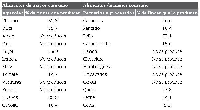 El 88 % de la comunidad se aproxima al concepto de seguridad alimentaria, mientras que el 22 % tiene una idea sobre el concepto. Se encontró además que el 100 % de la comunidad no sabe qué es la soberanía alimentaria. Los alimentos de mayor y menor consumo se presentan en la tabla 4, junto con el porcentaje de las fincas que los producen.