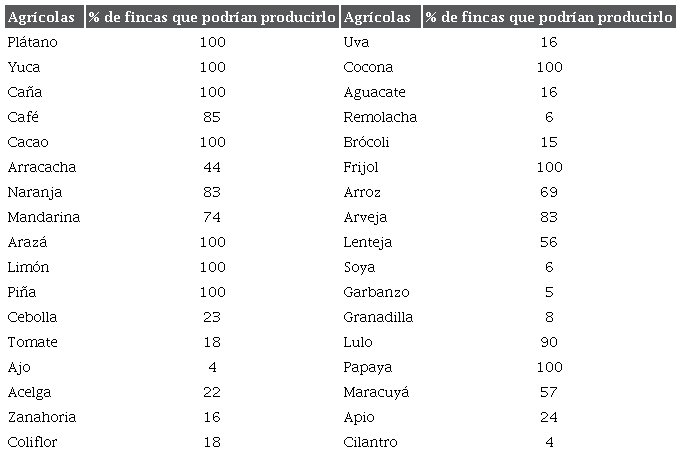 El 90,2 % de las familias consideran que se alimentan muy bien. El 59 % sostienen que el campo les ofrece lo necesario y con productos de calidad; el 24,6 % afirman que éstos alimentos son frescos y saludables, y el porcentaje restante consideran que deberían cosechar más para tener abundancia. El 16,4 % restante opina que se no alimentan bien porque tienen poca variedad y cantidad o porque no se cosecha lo suficiente, lo cual tiene los siguientes orígenes según los habitantes: el 41,4 % indica que los precios de venta son muy bajos, los costos muy altos y productos importados económicos; el 34,4 % menciona que falta eficacia en las políticas de gobierno sobre desarrollo rural; el 6,5 % lo atribuye a la pobreza, al desconocimiento y a la desmotivación; el 6,5 % cree que las nuevas generaciones y algunos apoyos del Gobierno hacen que las personas quieran más dinero con menos esfuerzo; el 4 % lo adjudica al mal estado de las vías y otro 4 % a los cultivos ilícitos, que son más rentables. De otro lado, el 3,2 % menciona que existe una concentración de las tierras más productivas. Por otra parte, los alimentos potenciales que podrían cultivarse se resumen en la tabla 5.