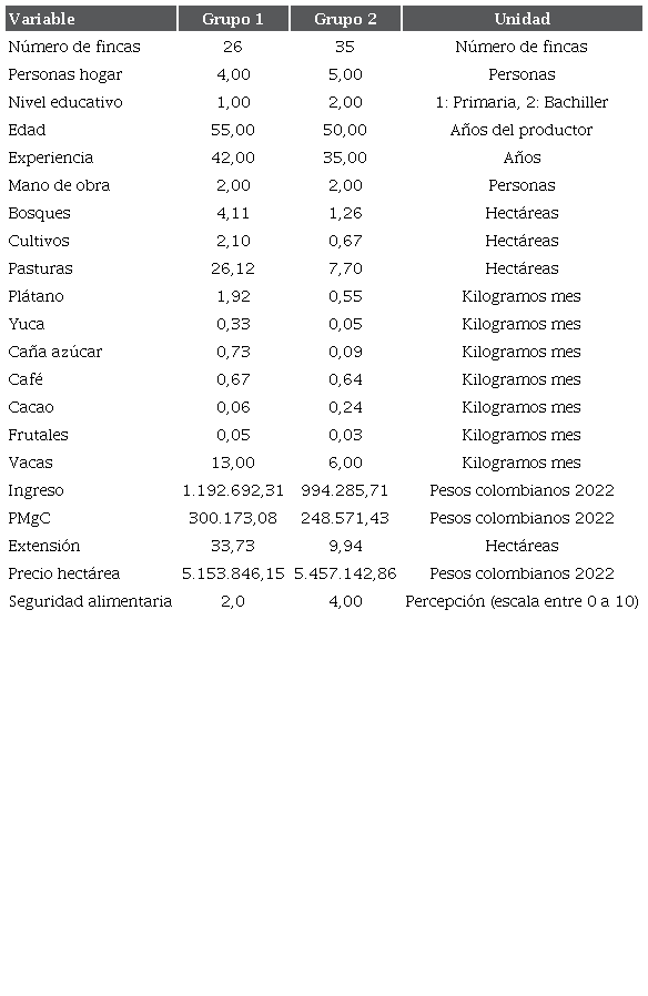Este grupo lo conforman el 43 % de las fincas de la muestra de estudio. La actividad principal de estas familias es la producción y comercialización de cultivos tradicionales (plátano, yuca, caña y café) y, en la parte pecuaria, realizan ganadería de leche con transformados en queso. El nivel educativo predominante en los productores es la primaria. La extensión de las fincas se clasifica, en su mayoría, en la categoría de fincas medianas (según UPRA, ver tabla 1). El número de vacas es superior en un 100 % respecto del grupo 2. Las hectáreas en pasturas, cultivos y bosques triplica a las del grupo 2. De igual forma, el ingreso y la PMgC fueron superiores. En contraste, el valor dado por hectárea de la finca y la valoración de la seguridad alimentaria fue inferior al que se registró en el grupo 2. La experiencia y la edad de los propietarios son superiores.