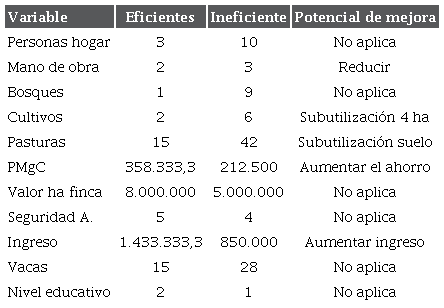 Bajo un modelo orientado a producto, con rendimientos constantes a escala, se encontraron 3 (6 %) fincas eficientes (con puntajes igual a 1) y 58 fincas ineficientes (94 %) con potencial de mejora relacionados con la subutilización del suelo en cultivos. El 81% de las fincas tuvieron puntajes de ineficiencia entre 0 y 0,1, y el 13 %, puntajes entre 0,1 y 0,2. Las fincas eficientes pertenecen al grupo 1: sistemas agropecuarios familiares de acumulación simple. El promedio de las características de estas tres fincas eficientes se comparó con la finca 25 (que pertenece al grupo 2) con el puntaje de ineficiencia más alto (0,6) para observar el significado del potencial de mejora (ver tabla 9).