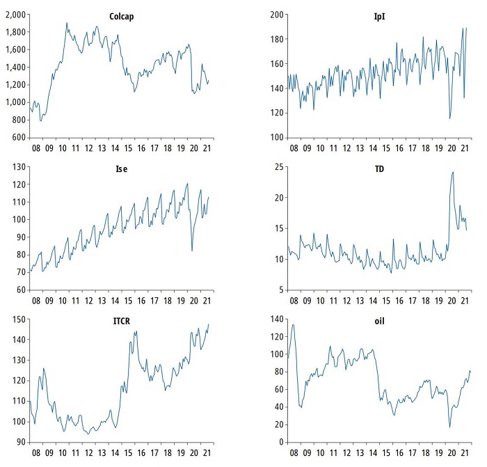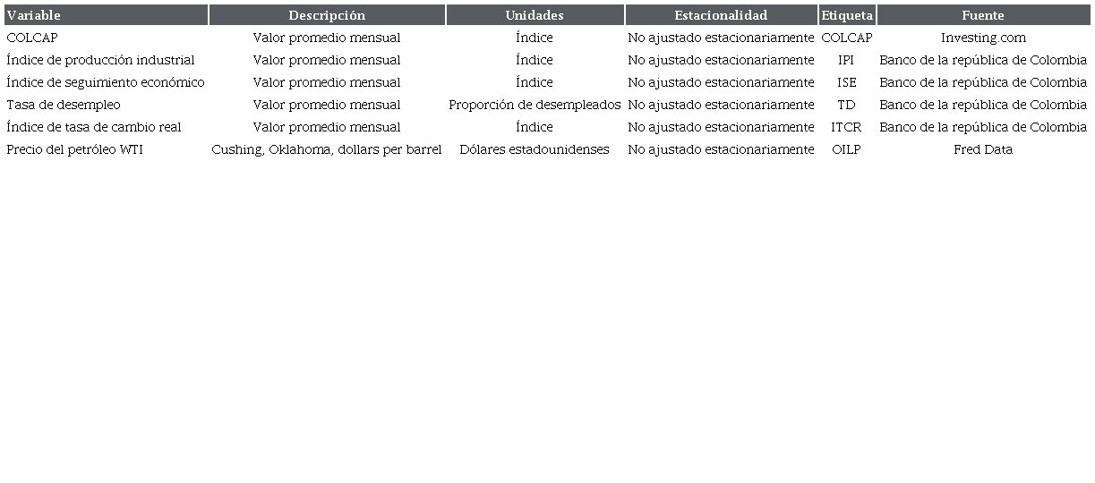 Los datos implementados en este estudio cuentan con una frecuencia mensual y corresponden al periodo febrero 2008 y julio 2021. Las variables de interés, descritas en la tabla 1, se definen como el índice COLCAP de la bolsa de valores colombiana, que está elaborado con las acciones más líquidas. También, se usa el índice de producción industrial, el índice de seguimiento económico, la tasa de desempleo, el índice de tasa de cambio real y el precio del barril de petróleo WTI.