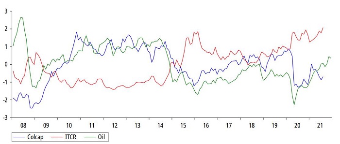 Por otro lado, la figura 2 muestra las variables del COLCAP, el precio del petróleo WTI y el índice de tasa de cambio real normalizadas, con el fin de analizar, en una misma unidad, las tres variables. A partir del gráfico, se infiere que el COLCAP y los precios del petróleo tienen un comportamiento similar. Por otro lado, el índice de tasa de cambio real tiene un comportamiento inverso. Esto se debe a la alta dependencia de los precios de las materias primas que tiene la economía colombiana, lo que genera que precios altos del petróleo presionen un alto ingreso de divisas, devaluando el dólar en la economía nacional (Oviedo-Gomez y Candelo- Viafara, 2022).