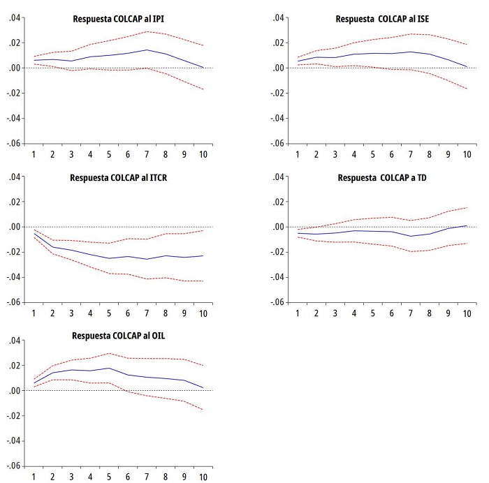 La figura 3 muestra las funciones impulso respuesta generalizadas a dos desviaciones estándar del modelo VAR estimado. De esta forma, se evidencia que el COLCAP responde positiva y significativamente a variables que se relacionan positivamente con la actividad económica colombiana, entre ellas están el índice de producción industrial, el índice de seguimiento económico y los precios del petróleo. Este resultado se sustenta desde el sentido de que el IPI y el ISE son indicadores del comportamiento de la economía, es decir, que un impulso de estos indicadores incentiva la inversión en empresas del país. Además, y debido a la dependencia que tiene la economía de la producción petróleo, un aumento de los precios del petróleo debería incentivar la inversión en ese sector, lo que se traslada a la bolsa de valores.