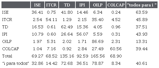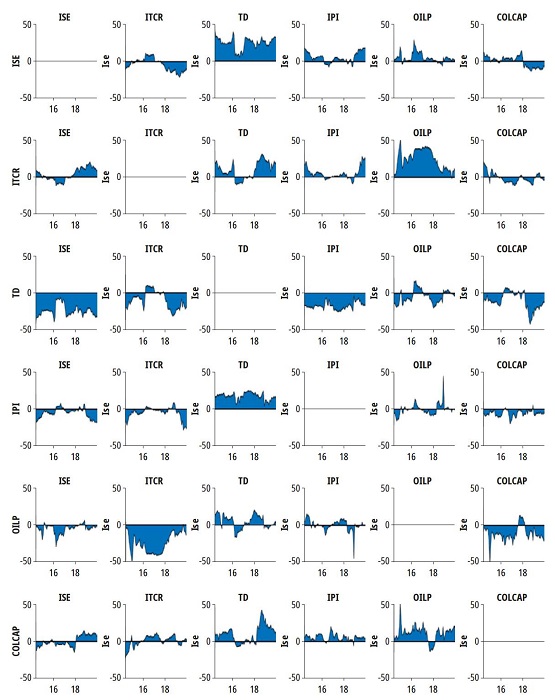 Por otro lado, la última columna de la tabla 4 describe la conectividad direccional total proveniente de los demás indicadores sobre cada variable de interés. De esta forma, los efectos generados por los demás indicadores oscilan entre un 13,3 % y 63,6 %. Con respecto a la bolsa de valores nacional, se observaron las siguientes medidas de conectividad por pares: desde el ISE para COLCAP fue del 1,04 %, desde el ITCR para COLCAP fue del 7,16 %, desde la TD para COLCAP fue del 0,92 %, desde el IPI para COLCAP fue del 2,84 % y desde el OILP para COLCAP fue del 27,49 %. Por lo tanto, 39,44 % de la volatilidad de la bolsa de valores se explica a través de las variaciones de los demás indicadores. Por su parte, la conectividad total del sistema es equivalente al 40,6 %.