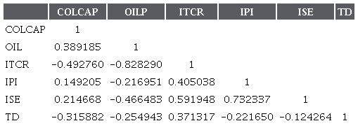 La tabla 2 muestra la correlación entre las variables de estudio. De esta forma, el COLCAP está relacionado positivamente con el precio del petróleo, el índice de producción industrial y el índice de seguimiento económico, lo que muestra indicios de que el COLCAP se encuentra intrínsecamente relacionado con la actividad económica. De la misma forma, el COLCAP se relaciona inversamente con la tasa de desempleo y con el índice de tasa de cambio real, porque incrementos en la tasa de desempleo reflejan un mal estado de la economía. Con respecto al índice de tasa de cambio, la relación se explica por el comportamiento inverso entre los precios del petróleo y la tasa de cambio.