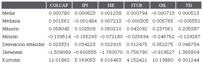 La tabla 3 muestra las estadísticas descriptivas de las variables en retornos logarítmicos. De estos datos, podemos observar que las variables tienen una distribución leptocúrtica, dado que el indicador de curtosis es mayor a 3, lo que implica que los datos están altamente concentrados sobre los valores medios de la distribución. Por otro lado, la distribución de los datos del COLCAP, IPI, ISE y OIL tienden a inclinarse sobre los datos negativo debido a que skewness es negativa, lo contrario sucede con el ITCR y la tasa de desempleo.