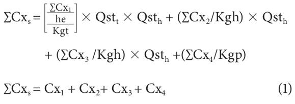 Donde ∑Cxs es la sumatoria del costo total unitario equivalente para obtener 1 kg de pan. Este total se obtiene de la suma de los costos unitarios equivalentes de cada eslabón que conforma la cadena de suministro del sector de panificación (MCSCP) para obtener el costo unitario por un kgp (kilogramo de pan). Este costo es acumulativo hasta llegar al cálculo final, así: