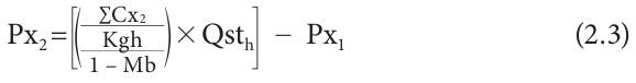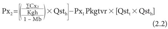 ∑Cx2 es la sumatoria de los costos totales de transformación del trigo en harina de trigo, Kgh es un kilogramo de harina de trigo obtenido del proceso de trilladora. Para obtener 1 kg de harina de trigo, se requiere 1,4 kgt (kilogramos de trigo). De 1 kgt se obtienen 0,714 kgh. Qsth es la cantidad estándar de harina de trigo necesaria para obtener 1 kgp (kilo de pan) (0,6 kgh es el promedio actual); B1, B2 y B3 son los costos unitarios de cada proceso en el eslabón de trilladora para transformar y obtener un kilogramo de harina de trigo sin acumulación; Cx2kgh es el costo de producción de un kilogramo de harina de trigo y Cx2 es el costo unitario equivalente de la harina de trigo para producir 1 kgp.