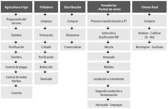 El proceso inicia con la agricultura (eslabón 1), donde se siembra el principal insumo para la elaboración del pan, el trigo. El paso posterior es la empresa trilladora o harinera (eslabón 2), que se encarga de la transformación del trigo en harina de trigo. Esto incluye la clasificación, selección por tamaño y de la calidad del grano, para luego trasladar de manera directa al productor, en alianza con el eslabón 3, que es la distribución, referido a la comercialización de la harina de trigo, que luego se traslada al eslabón 4, que son las panaderías o puntos de venta; para este caso en especial, se integran otros componentes considerados relevantes para la producción del pan, como los huevos, los lácteos y sus derivados (queso), la levadura, la grasa y la sal, considerado como otros costos de materiales. El último eslabón (el 5) es el cliente, usuario final de la cadena de suministro. Existen importaciones de otras cadenas productivas de productos similares y sustitutos que compiten por mercados semejantes, cuestión que motiva a la cadena productiva interna a desarrollar estrategias para mantenerse vigentes en el mercado.