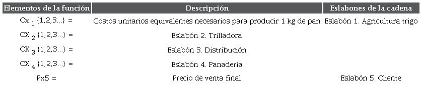 El costo total unitario integrado para producir un kilogramo de pan, sumando los diferentes costos unitarios equivalentes por cada eslabón productivo, tiene en cuenta la cantidad de trigo necesaria para producir un kilogramo de harina de trigo, y a su vez, la harina de trigo requerida para producir un kilogramo de pan, hasta llegar al costo final de un kilogramo de pan con los recursos necesarios en la cadena de suministro sin utilidad. Para calcular la utilidad en cada eslabón, se emplea la función lineal (1):