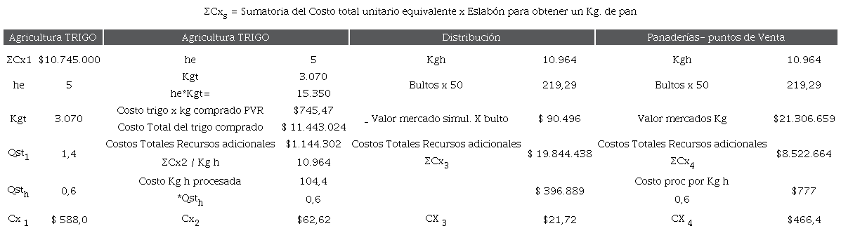 ∑Cx4 es la sumatoria de los costos de transformación para obtener 1 kg de pan. Se incluyen los costos de otros materiales diferentes a la harina de trigo, la cual ya fue monetizada en los otros eslabones. También se incluyen los costos de conversión. Kgp son los kilogramos de pan obtenidos del proceso.