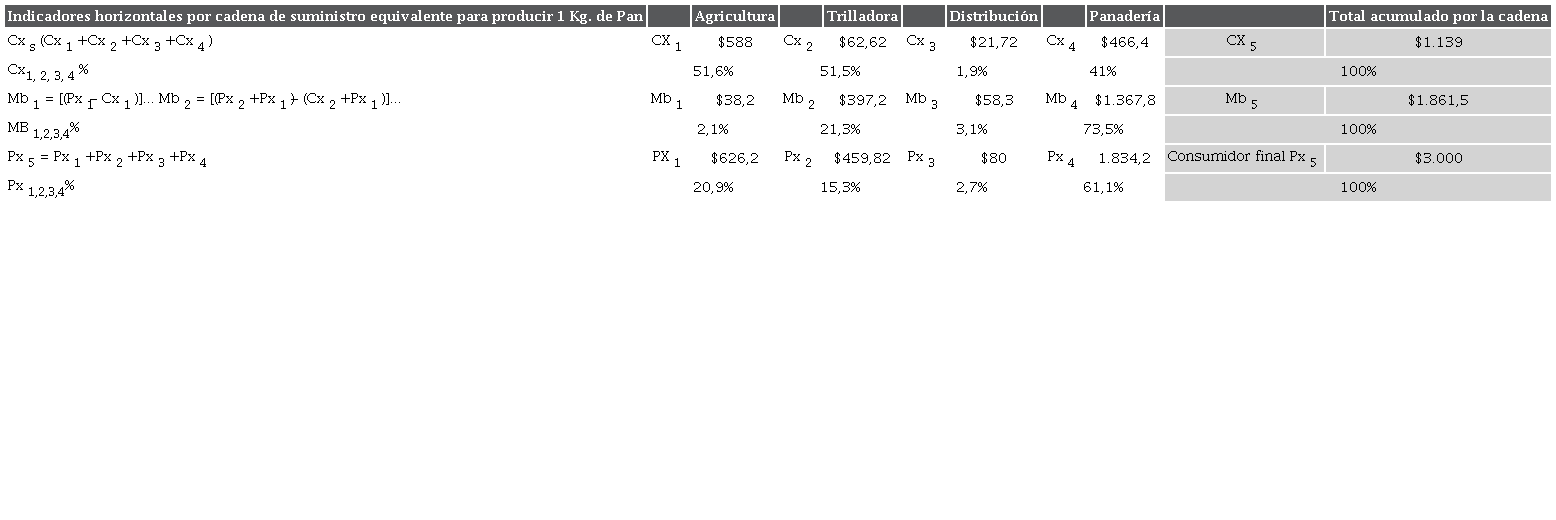 Px3 es el precio de venta equivalente al transporte de la harina necesaria para elaborar un kilogramo de pan al final de la cadena, donde se resta el valor de los precios de los dos eslabones anteriores, de manera que solo se mida el precio que se va acumulando por cada eslabón.