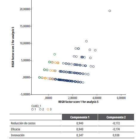 El análisis factorial permite concluir que hay dos componentes que explican gran parte de las diferencias entre los clústeres. Estos componentes están relacionados con el enfoque interno o externo que adoptan las organizaciones y que es determinante para comprender sus comportamientos de innovación (Salavou et al., 2004). El enfoque interno se caracteriza por priorizar la eficiencia de las operaciones existentes, trazando como objetivo de la innovación la producción y distribución de bienes y servicios de la forma más eficiente posible, en busca de proteger los mercados en los que opera la compañía. De esa manera, es probable que organizaciones con un enfoque interno logren reducir significativamente sus costos y operen bajo métodos y procesos estructurados (O'Regan y Ghobadian, 2005). Por otro lado, el enfoque externo se caracteriza por una búsqueda continua de oportunidades de innovación que satisfagan necesidades de mercado. Estas organizaciones probablemente son pioneras en el desarrollo de productos, servicios y procesos, por lo que suelen ser primeras en el mercado y buscan mantener y explotar esta posición (O'Regan y Ghobadian, 2005).